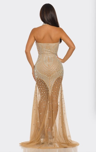 Shine effortlessly in this stunning nude crystal halter mermaid dress, featuring a choker-inspired neckline adorned with sparkling crystals. Sheer panels across the bust create the illusion of a strapless design, while the fitted mermaid silhouette elegantly hugs the body.