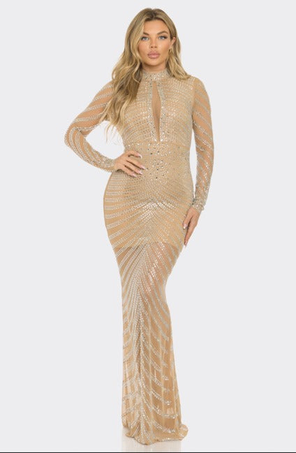 Radiate elegance in this stunning nude crystal mermaid dress. The fitted mermaid cut enhances your curves while sheer long sleeves and sheer panel at the center neckline add a sophisticated, delicate touch.
